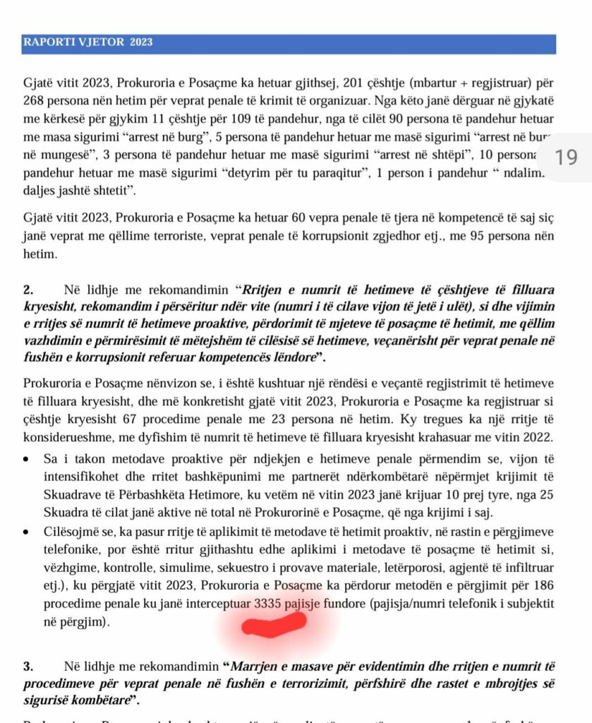 gjithashtu sekuestro edhe i provave aplikimi materiale, metodave tê posacme tê hetimit pergjimeve telefonike, por është rritur gjithashtu edhe metoda e vëzhgime, kontrolle, simulime, letërporosi, agjentë të infiltruar etj.), ku përgjatë vitit 2023, Prokuroria e Posaçme ka përdorur metodën pērgjimit për 186 procedime penale ku, janë interceptuar 3335 pajisje fundore (pajisja/numri telefonik i subjektit në përgjim) weblajm.com