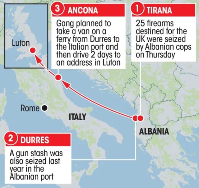 Sipas medias britanike “The Sun”, armët dhe qindra fishekë ishin porosi për bandat shqiptare në Angli, të cilat luftojnë për terrenin e shitjes së drogës dhe zonat e prostitucionit në Londër.