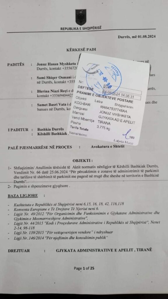 Ne të bindur në të drjetën tonë, në shërbim të qytetarëve durrsak, kemi ushtruar tagrin ligjor duke depozituar sot pranë Gjykatës Administrative të Apelit në Tiranë, Kërkesë Padinë për anullimin e aktit normativ nënligjor në lidhje me sa më sipër cituar.