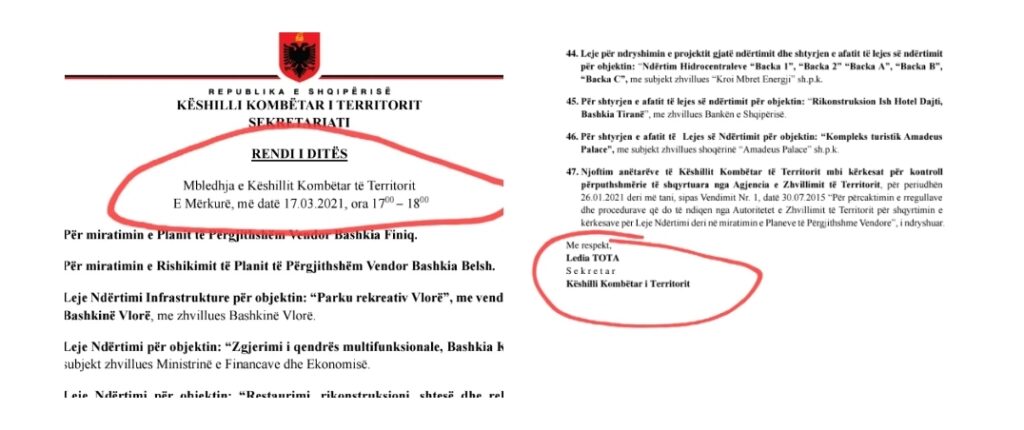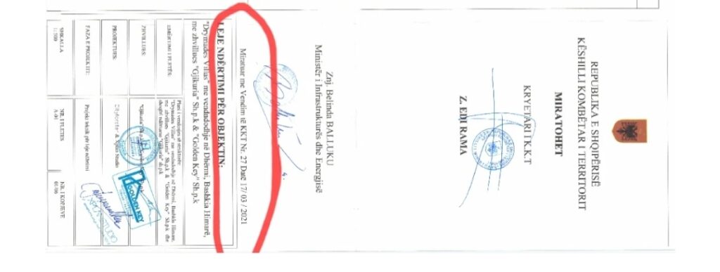Një lejë për ndërtim resorti e firmosur nga kryemistri Edi Rama, ministrja Belinda Balluku, dhe ish-shefja e KKT-së, Ledja Tota, orienton për një implikim të tyre dhe manipulim të dokumentacionit.