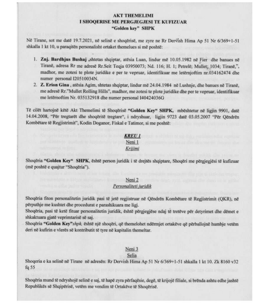 Sipas dokumenteve të publikuara sot nga portali Prapaskena, leja për resort i është dhënë kompanisë Golden Key, në 17 mars 2021, ndërsa vet kompania, rezulton se është themeluar katër muaj më vonë, në datën 19 korrik 2021.