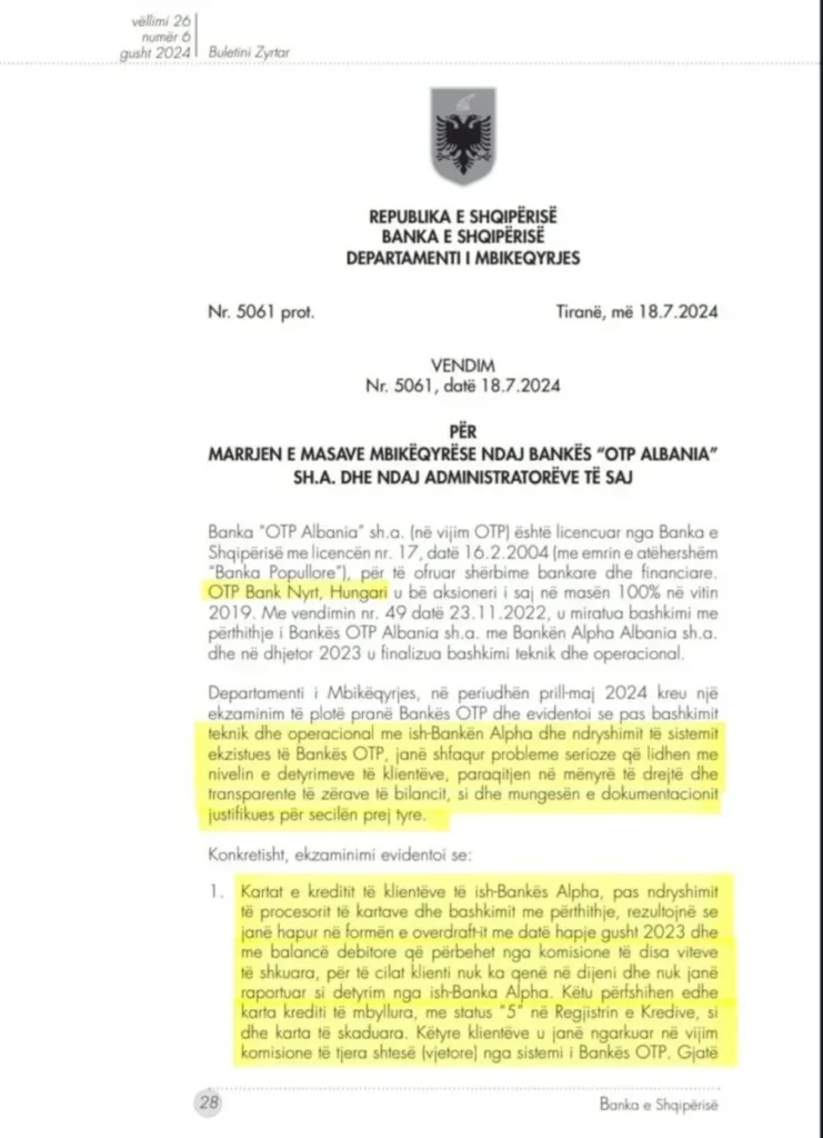 “Kartat e kreditit të klientëve të ish-Bankës Alpha, pas ndryshimit të procesorit të kartave dhe bashkimit me përthithje, rezultojnë se janë hapur në formën e overdraft-it me datë hapje gusht 2023 dhe me balancë debitore që përbëhet nga komisione të disa viteve të shkuara, për të cilat klienti nuk ka qenë në dijeni dhe nuk janë raportuar si detyrim nga ish-Banka Alpha. Këtu përfshihen edhe karta krediti të mbyllura, me status “5” në Regjistrin e Kredive, si dhe karta të skaduara. Këtyre klientëve u janë ngarkuar në vijim komisione të tjera shtesë (vjetore) nga sistemi i Bankës OTP”.