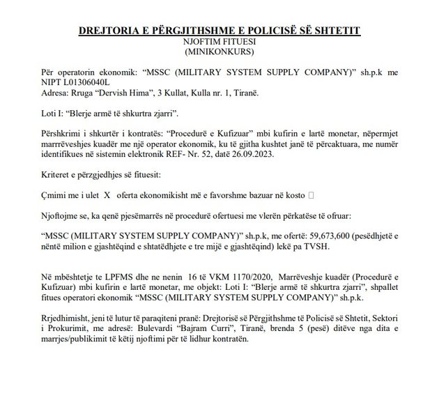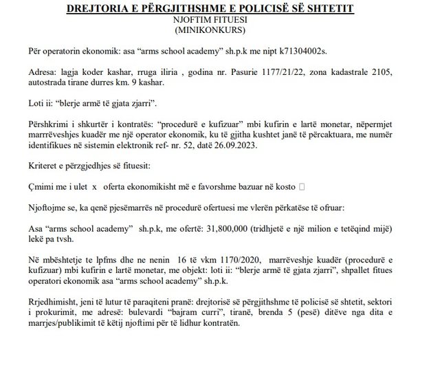 Në të njëjtën kohë, Policia e Shtetit shpejtoi të shpallë fituesin dhe të lidhë kontratën edhe për tenderin me objekt “blerje armë të gjata zjarri”. Sërish shkruhet se bëhet fjalë se fituesi do të shpallet kush ofron më pak, por edhe në këtë procedurë mori pjesë vetëm një kompani ASA “Arms School Academy” me vlerë 31.800.000 lekë pa TVSH. Policia e ka urgjente, pasi i bëri me dije firmës të paraqitet brenda 5 ditësh. Ndërkohë, në të njëjtin buletin, policia ka lidhur edhe kontratën me këtë firmë. Shuma nga 31 milionë pa TVSH shkoi në 38 milionë pa TVSH.Në muajin shkurt 2024, Policia e Shtetit bëri tenderët e parë të armëve, pistoletave dhe automatikëve. Bëri tenderin me objekt “blerje arme zjarri”, e ndarë në lote, me një kohëzgjatje 48 muaj. Në procedurë morën pjesë “MSSC (MILITARY SYSTEM SUPPLY COMPANY) me vlerë 146.69.600 lekë dhe firma ASA “ARMS SCHOOL ACADEMY” me vlerë 159.583.200. Në atë kohë pati një garë, teksa fitues u shpall “MSSC (MILITARY SYSTEM SUPPLY COMPANY)” që ofroi 146 milionë lekë.