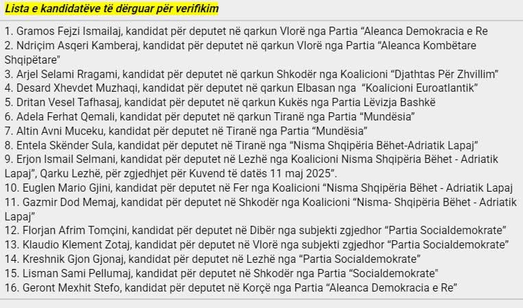 Komisioni Qendror i Zgjedhjeve (KQZ) ka dërguar për verifikim në Prokurorinë e Përgjithshme 16 kandidatë për deputetë, të cilët janë propozuar nga parti politike të ndryshme. Kjo procedurë kryhet në kuadër të ligjit të dekriminalizimit, i cili ka për qëllim të sigurojë integritetin dhe transparencën e procesit zgjedhor.