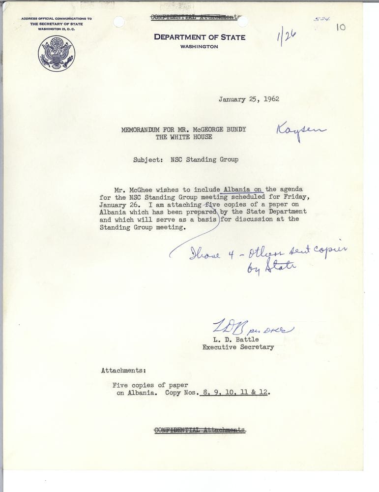 Z. McGhee dëshiron që Shqipëria të përfshihet në rendin e ditës të mbledhjes së Grupit të Përhershëm të KSK-së, të planifikuar për të premten, 26 janar. Po bashkëngjis pesë kopje të një materiali mbi Shqipërinë, të përgatitur nga Departamenti i Shtetit, i cili do të shërbejë si bazë për diskutim në atë mbledhje. (nënshkrim) L. D. Battle, Sekretar Ekzekutiv.