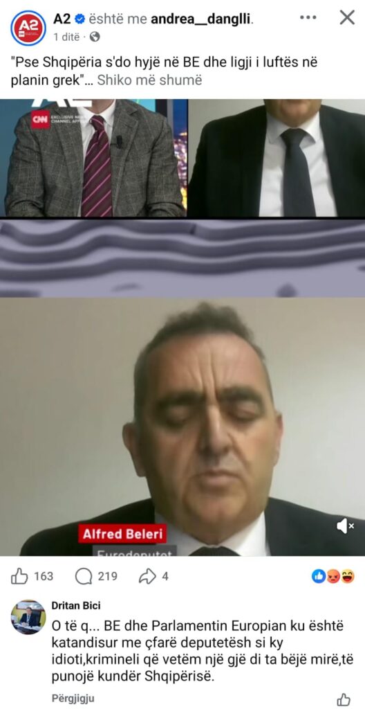 Dritan Bici, ish kryebashkiak dhe ish deputet nuk e ka pritur mirë intervistën e Fredi Belerit për mediat duke reaguar më komente jo fort etike për institucionet e BE.