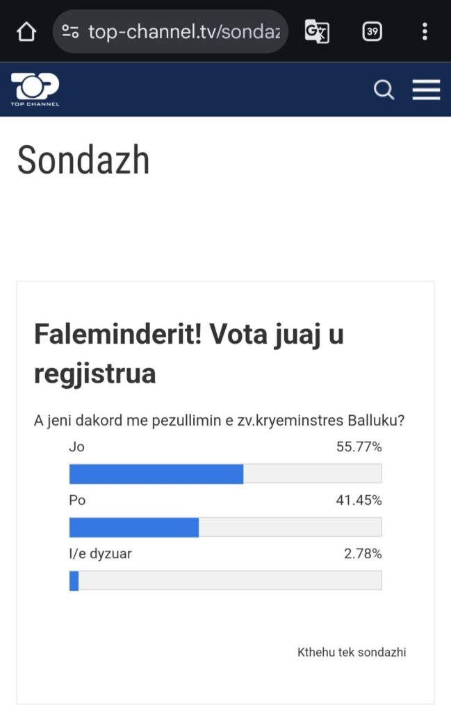 Linku na coi ne nje sondazh te organizuar nga Top Channel ne lidhje me pezullimin e zv.kryministres Balluku. Pyetja e sondazhit eshte nese jemi dakord apo jo me pezullimin e saj. Opsionet e pergjigjeve jane “po”, “jo” dhe “i/e dyzuar”.