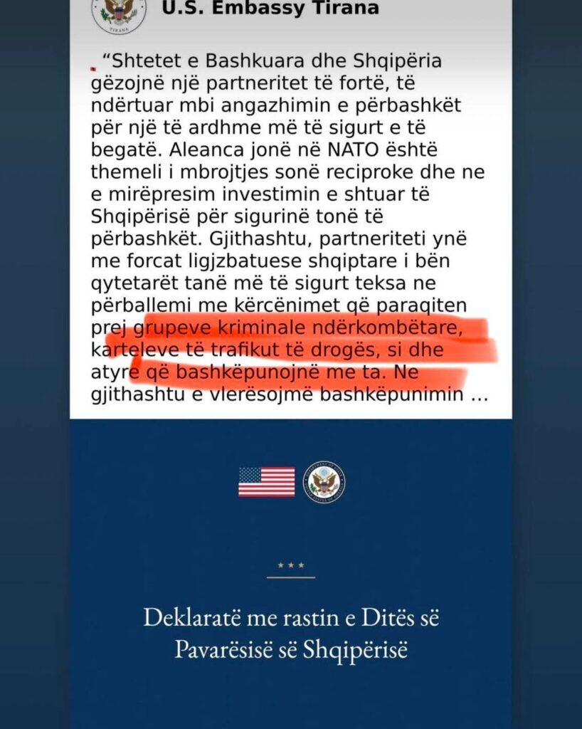 Ka një ironi të rëndë kur Sekretari Amerikan i Shtetit, në një mesazh zyrtar për Ditën e Pavarësisë, e quan partner Shqipërinë në luftën kundër kriminalitetit transnacional. Ironi që nuk ka nevojë për koment, kur mendon se këtë mesazh e lexon një qeveri që ka mbuluar vendin me laboratorë kokaine, pista avionësh të fshehtë, porte të privatizuara për trafik, dhe me një polici që ruan plantacionet, jo rendin.