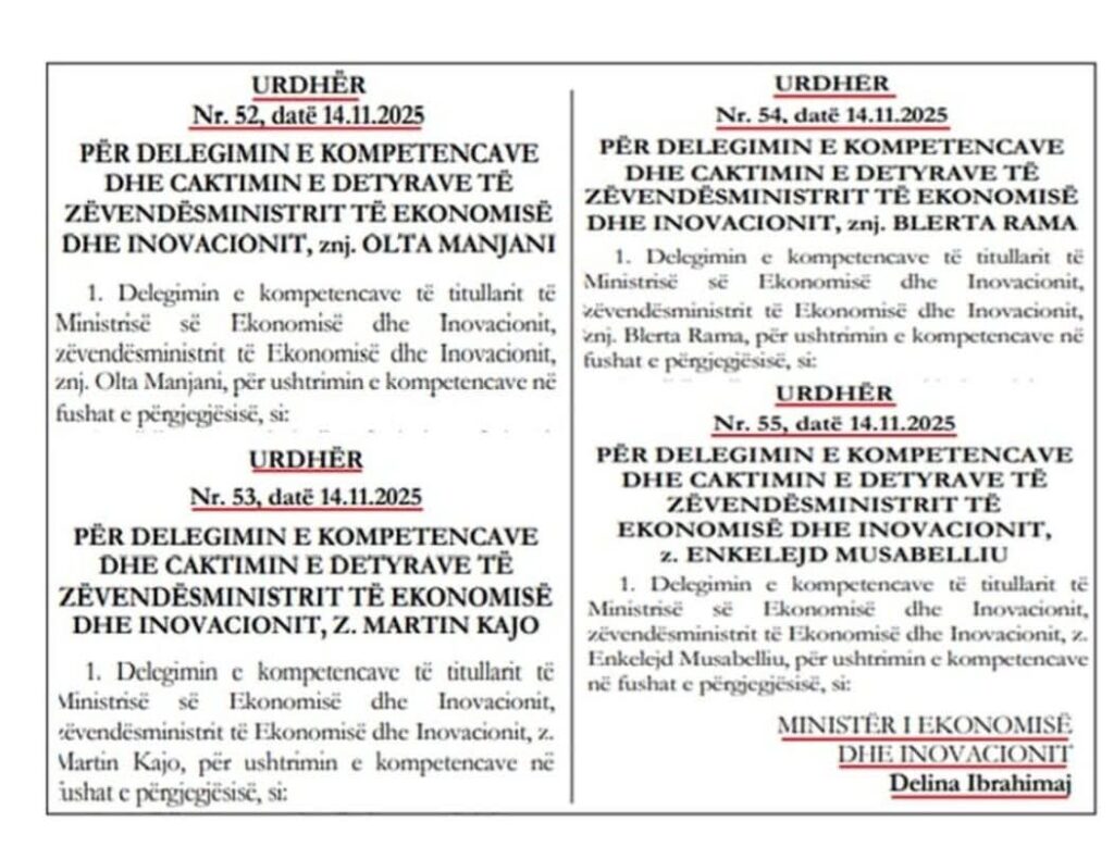 👉Me Urdhër Nr. 52, datë 14 nëntor 2025, ministrja Delina Ibrahimaj ka deleguar 13 kompetenca te zëvendësministrja Olta Manjani.