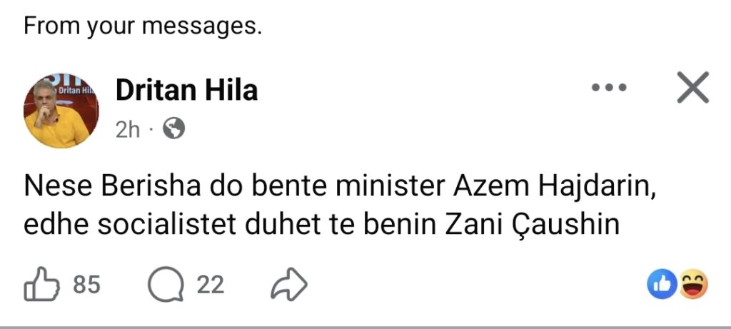 Dritan Hila, gazetar, publicist dhe ish-diplomat shqiptar ka bërë një deklaratë të fortë të rrjetet sociale. Ai thotë se Azem Hajdari i PD është i ngjashëm me Zani Çaushin e PS në 97. Një krahasim që çalon si të gjitha krahasimet. Më pas ka replikuar edhe me kolegun e tij Muharrem Meko.