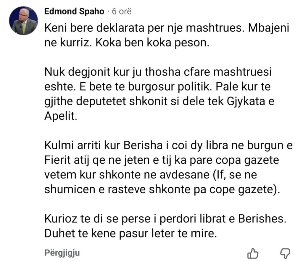 Spaho: Salianji ka fshirë prapanicën me librat e Berishës, deputetët i shkonin si dele te gjykata 15 December , 2025 Më pak se 1 min. lexim Advertisements Ish deputeti I qarkut Fier Edmond Spaho ka vijuar sulmet kundër Ervin Salianjit dhe Partisë Demokratike. Sipas tij, Berisha i çoi dy libra. Latest articles Balliu: Flamuri na bërtiti që firmosëm për Shabanin, mua ma kërkoi si nder Ina Zhupa Apertura 15 December , 2025 Merr flakë një makinë në Llogara, një person digjet brenda Apertura 15 December , 2025 Veliaj kërkon ti jepet rroga si kryetar Bashkie, kërkesa në KQZ Apertura 2 15 December , 2025 Grenell në Tiranë për takime të rëndësishme Apertura 15 December , 2025 Related articles Balliu: Flamuri na bërtiti që firmosëm për Shabanin, mua ma kërkoi si nder Ina Zhupa Apertura 15 December , 2025 Merr flakë një makinë në Llogara, një person digjet brenda Apertura 15 December , 2025 Veliaj kërkon ti jepet rroga si kryetar Bashkie, kërkesa në KQZ Apertura 2 15 December , 2025
