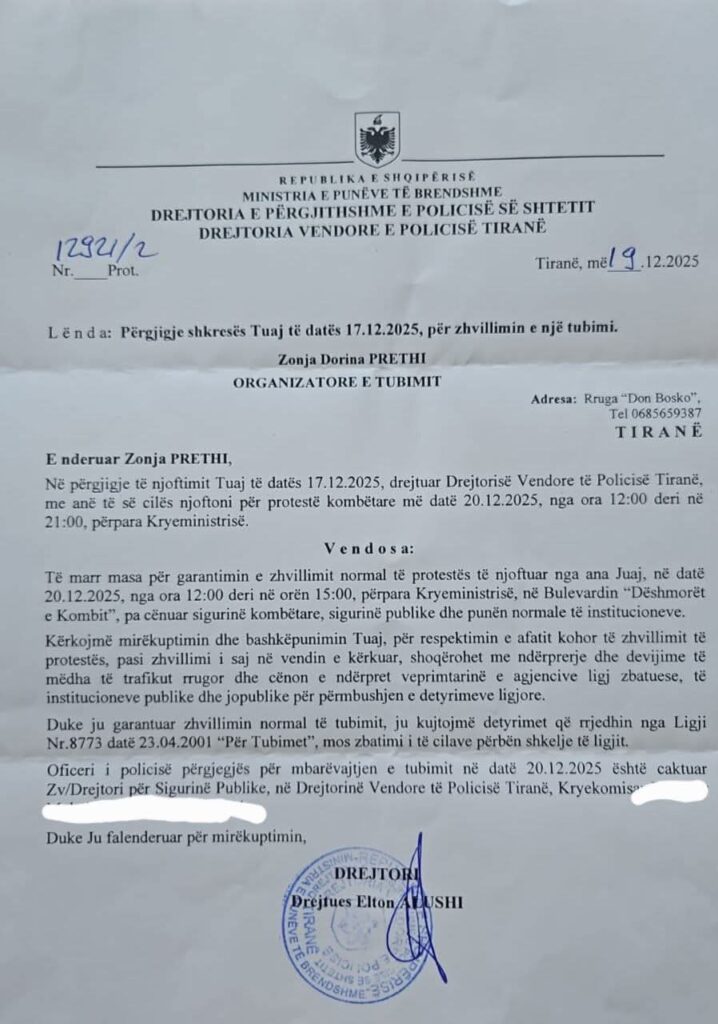 Kreu i Lëvizjes Shqipëria Bëhet, Adriatik Lapaj i cili po proteston prej disa ditësh para kryeministrisë duke u përplasur me policinë e shtetit, pak minuta më parë përmes një postimi në faqen e tij facebook ka publikuar shkresën, nëpërmjet të së cilës tregon se protesta ka pasur leje, e sipas tij shteti po sillet si organizatë kriminale.