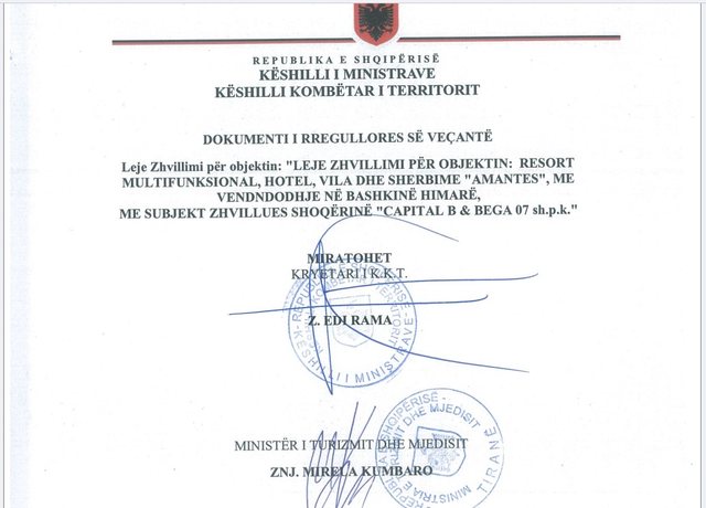 Me veprime dhe dokumente tepër të pastra, duke qenë se zona është tërësisht shkëmbore, ata kanë arritur që të bindin qeverinë dhe veçanërisht ish-ministren e Mjedisit Mirela Kumbaro, e cila ka firmosur edhe lejen e zhvillimit.