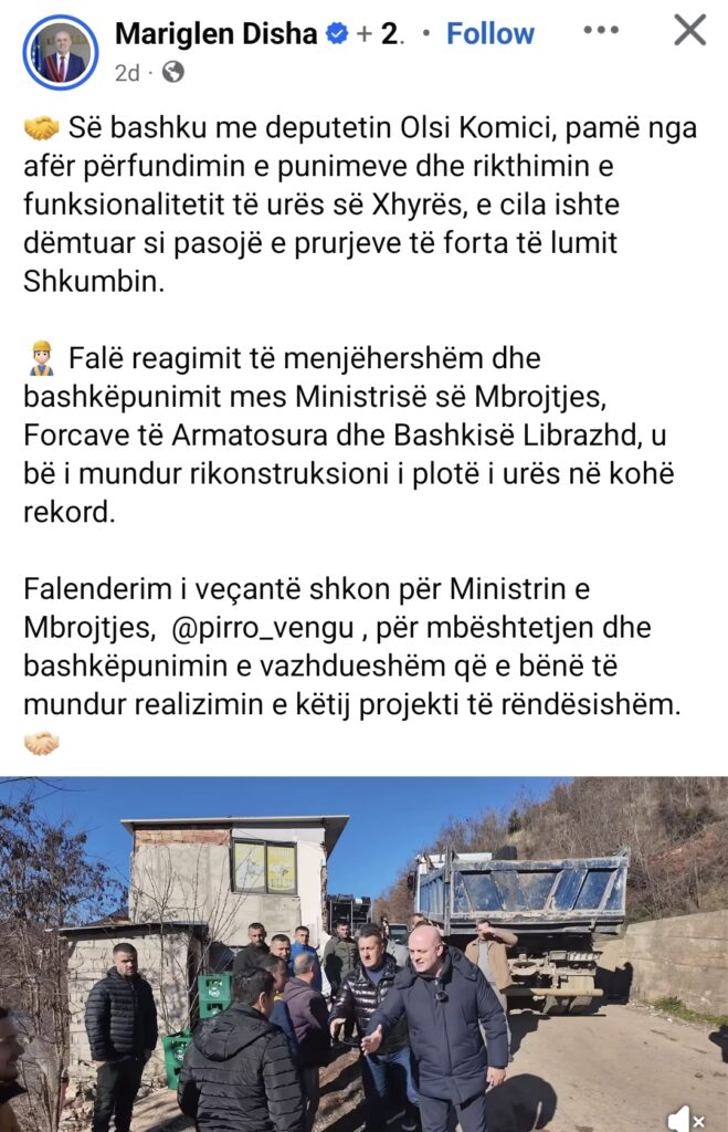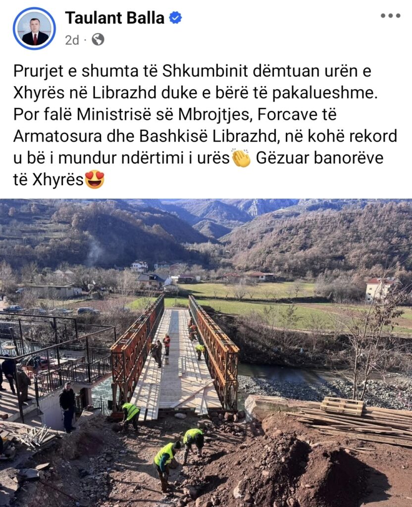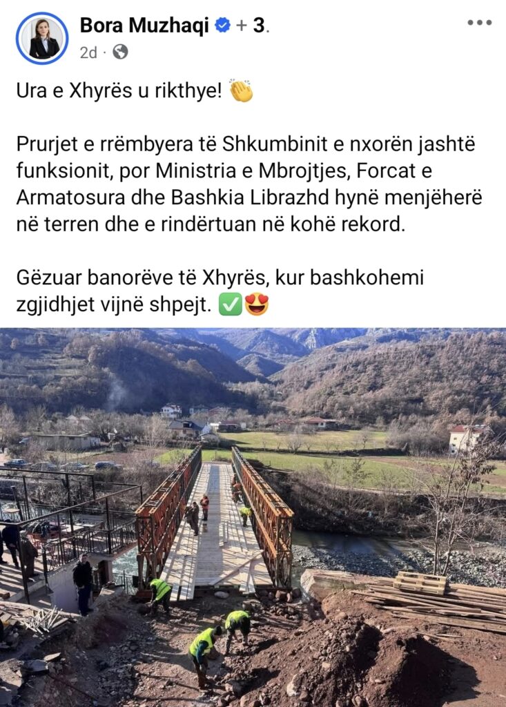 Prurjet e shumta të Shkumbinit dëmtuan urën e Xhyrës në Librazhd duke e bërë të pakalueshme. Por falë Ministrisë së Mbrojtjes, Forcave të Armatosura dhe Bashkisë Librazhd, në kohë rekord u bë i mundur ndërtimi i urës. Por nuk mjafton me kaq. Deputetët e PS dhe kryebashkiaku Disha janë lëshuar në marrje meritash e dekoratash: