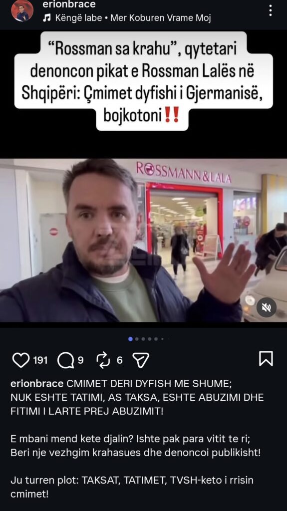 Deputeti veteran i PS Erjon Braçe përmes një komunikimi publik ka zbuluar lojërat me çmimet të kompanisë së njohur Rosmanlala dhe ka bërë një gjë të mirë për konsumatorët. Do të ishte 100 % e drejtë sikur Braçe të ngrinte zërin edhe për kompaninë e kolegut të tij të PS Vullnet Sina që është denoncuar nga mediat se Big Market mashtron me etiketat konsumatorët. Një standard për të gjithë.