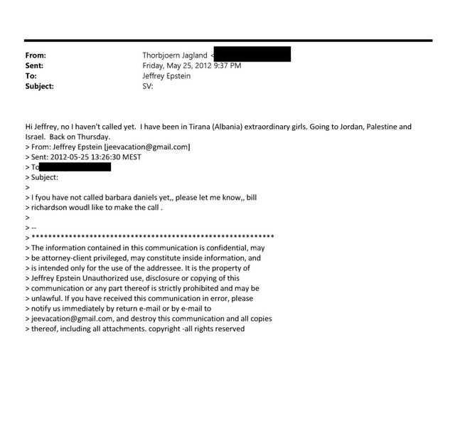 Një email i datës 25 maj 2012 tregon se Thorbjørn Jagland, Sekretar i Përgjithshëm i Këshillit të Europës në atë periudhë, i ka dërguar një mesazh Jeffrey Epstein, një ditë pas një vizite zyrtare në Shqipëri.