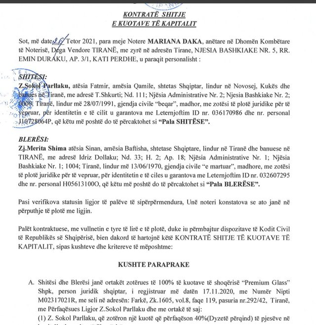 Nga nga Qendra Kombëtare e Biznesit, dokumente noteriale apo hipotekore, ku duket qartë lidhja e ish-nëndrejtorit Daniel Shima me kompaninë “Premium Glass”, e themeluar në vitin 2021. Një vit më vonë, aksionere me 100 % të aksioneve bëhet Merita Shima, nëna rrobaqepëse e Daniel Shimës.