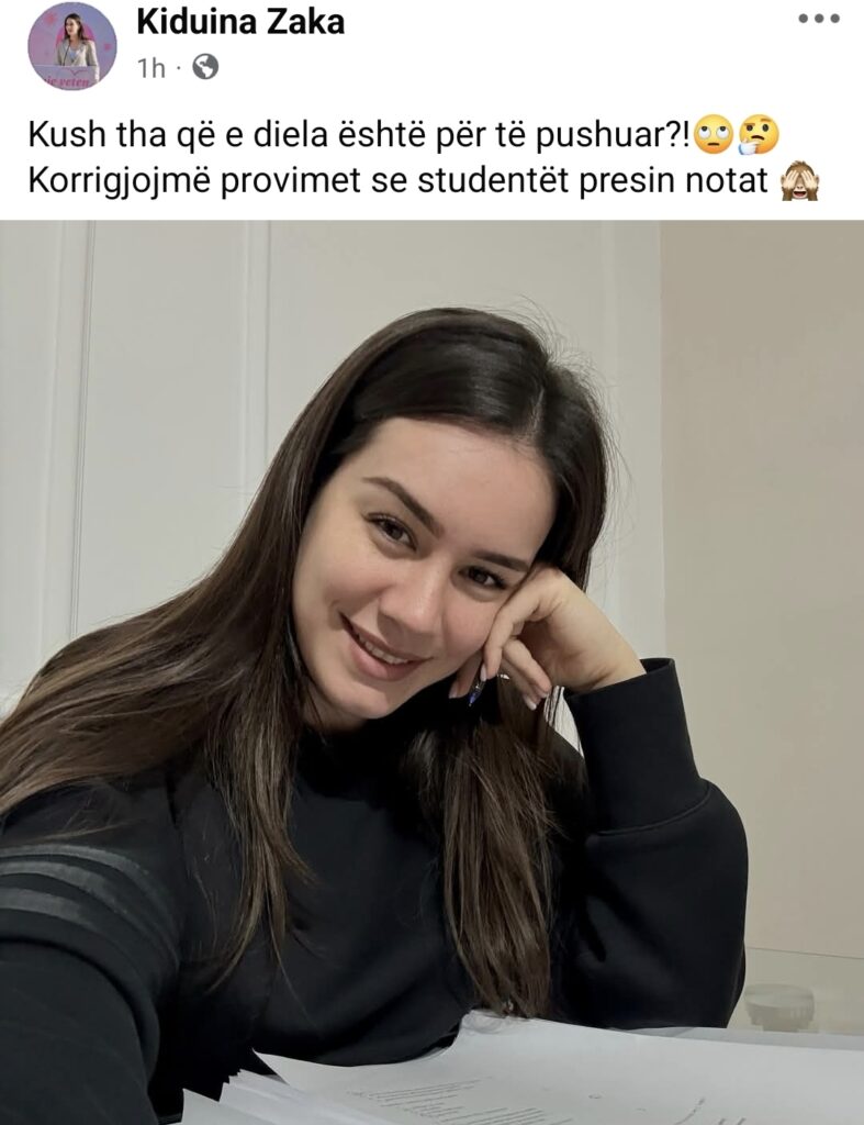 Deputetja e PS Kiduina Zaka, përfaqësuesi e Lushnjes dhe filozofisë “ska kohë për pushim” ka deklaruar se nuk bën pushim të dielën pa korrigjuar provimet e studentëve që mezi presin notën e saj. Znj. Zaka ka një doktoraturë në psikologji nga Universiteti i Tiranës.