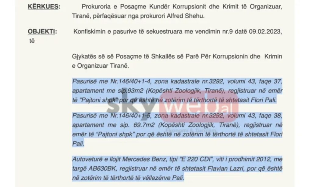 Në të njëjtin vendim është konfiskuar edhe një automjet tip Mercedes Benz E 220 CDI, i prodhimit të vitit 2012, me targë AB630BK. Automjeti rezulton i regjistruar në emër të shtetasit Flavian Lazri, por sipas gjykatës është përdorur dhe kontrolluar në mënyrë të tërthortë nga vëllezërit Pali.