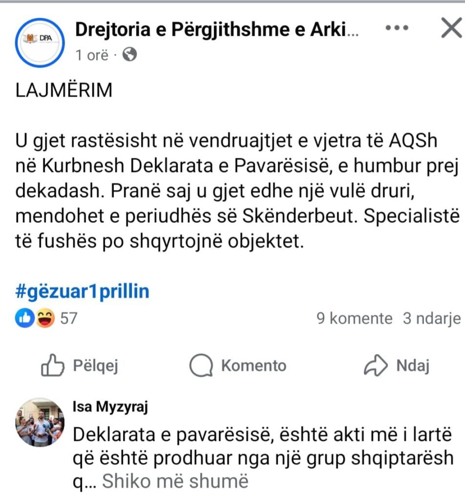 SKANDAL | Drejtoria e Përgjithshme e Arkivave tallet me shqiptarët: Gjetëm Deklaratën e Pavarësisë me 1 prill 1 April , 2026 Më pak se 1 min. lexim Advertisements Latest articles Rama zbulon pas 13 vitesh kontrabandën e naftës, 1 milion tonë në vit Apertura 1 April , 2026 Ambasada e SHBA jep alarmin për sigurinë e amerikanëve në Shqipëri Apertura 1 April , 2026 Holta Zaçaj zgjidhet zëvendës guvernatore e Bankës së Shqipërisë Fakti i Fundit 1 April , 2026 PD nga një parti fituese, në një parti paranojake! Gjen armiq kudo Apertura 1 April , 2026 Related articles Rama zbulon pas 13 vitesh kontrabandën e naftës, 1 milion tonë në vit Apertura 1 April , 2026 Ambasada e SHBA jep alarmin për sigurinë e amerikanëve në Shqipëri Apertura 1 April , 2026 Holta Zaçaj zgjidhet zëvendës guvernatore e Bankës së Shqipërisë Fakti i Fundit 1 April , 2026