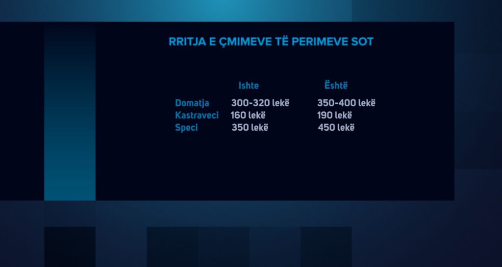 Per domatet, kastravecat dhe një grup zarzavatesh të tjera, kryesisht nga importi, çmimet janë shtrenjtuar me rreth 20% . Vetëm domatet që vijnë nga Greqia kanë arritur deri në 400 lekë për kilogram në tregjet me pakicë.