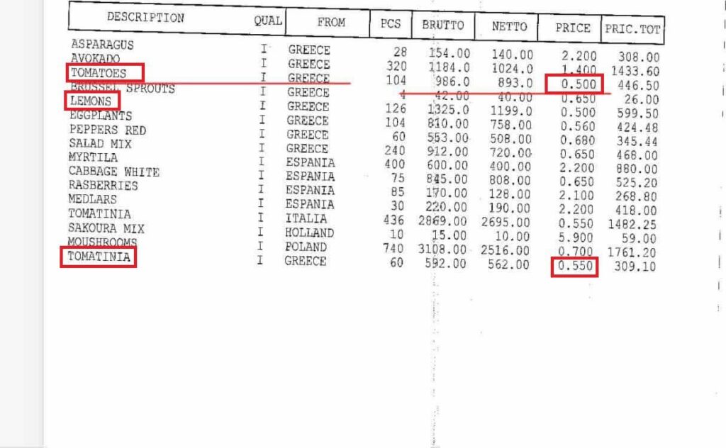 Të dhënat e siguruara nga Top Channel tregojnë se vlera më e lartë mban datën 23 mars, ku 14,450 kg domate nga Turqia janë blerë 899,516 lekë. Nëse bëjmë një llogari të thjeshtë, çmimi i domates në këtë rast i blerë është 62 lekë. Por nga ana tjetër, ky produkt konsumatorëve u ka kushtuar 350-600 lekë për kg.