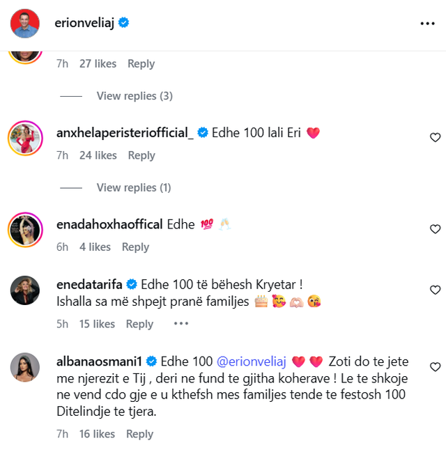 Emra si Çiljeta Xhilaga, Noizy, Anxhela Peristeri, Eneda Tarifa, Albana Osmani, Gaz Paja etj e urojnë kryebashkiakun e Tiranës për ditëlindje në rrjetet sociale.
